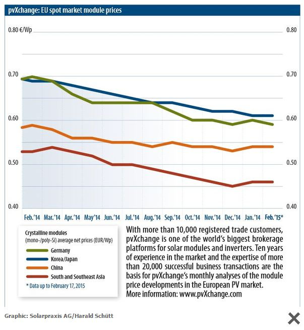 I hear this a lot. So let me correct it. Here is the price, as of February 2015, of solar modules, per watt sold in Europe. SE Asia (Malaysia, mostly) is cheapest. China is next. Japan, Korea, and Germany are slightly above that.