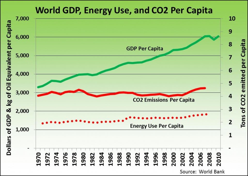What about on a global basis? Here there is still an increase occuring in per-capita energy use and per-capita CO2 emissions. But the increase in per-capita GDP is much larger.