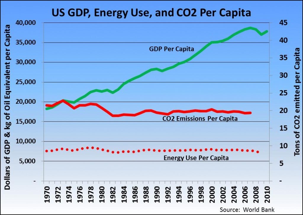 Essentially, we've doubled the size of the US economy (per person) since 1970, while reducing per capita CO2 emissions and keeping energy use flat. Even after adjusting for outsourced energy use (manufacturing in China, for example), these numbers stay essentially the same, with per-capita CO2 emissions never returning to their 1970 high.