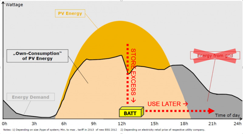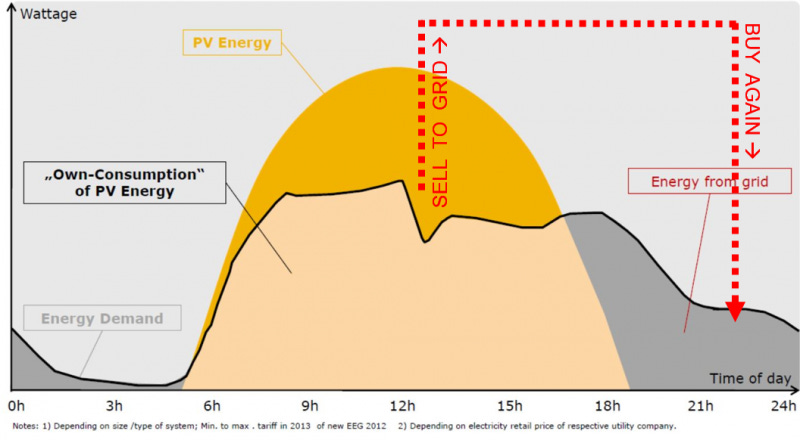 Under what circumstances would the second scenario be economically advantageous over the first? In short: The difference in price between grid electricity and the net metering rate / feed-in-tariff is the price that batteries have to meet. In Germany, where electricity is expensive, and feed-in-tariffs have been plunging, this gap is opening wide.