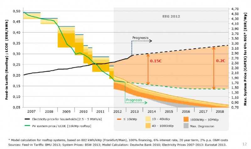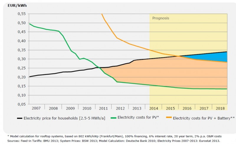 GTAI and Deutsche Bank’s conclusion – based on the price trends of solar, batteries, electricity in Germany, and German feed-in-tariffs – is that ‘battery parity’, the moment when home solar + a lithium-ion battery makes economic sense, will arrive in Germany by next summer, 2016.