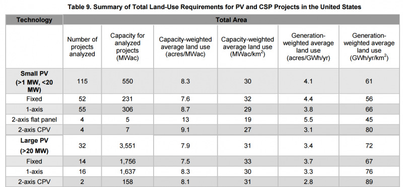 The second to last column tells us that, weighted by how much electricity they actually produce, large solar PV facilities need 3.4 acres of total space (panels + buildings + roads + everything else) for each Gwh of electricity they produce.