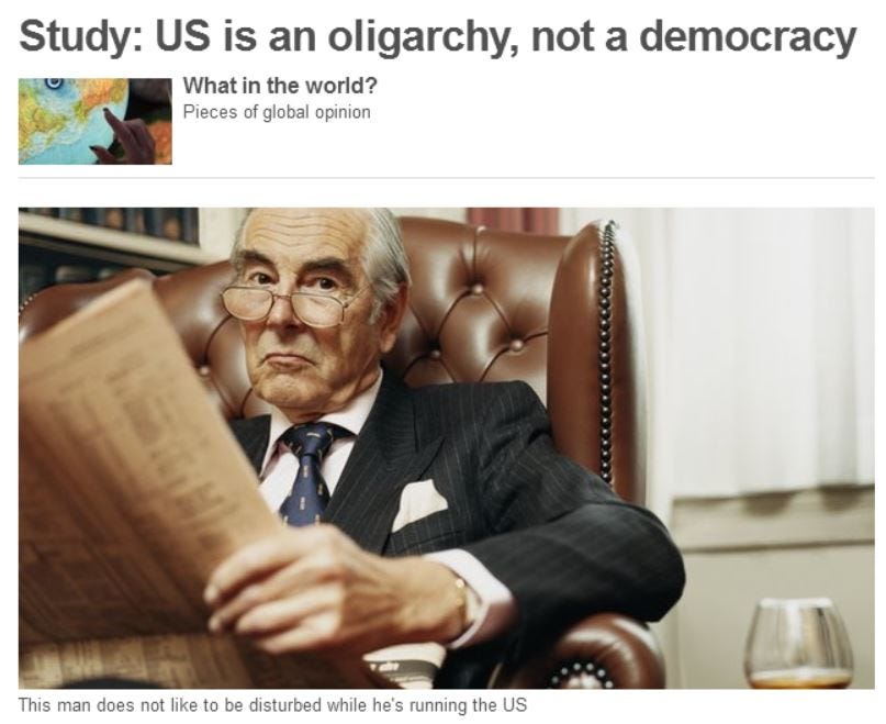 There’s a new study out which, press outlets are telling me, shows that the United States is now an oligarchy, ruled by the rich and powerful, and perhaps that the US has been sliding in this direction for decades.