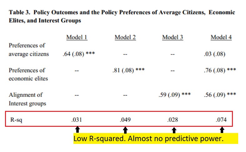 Specifically: The mathematical model the researchers construct to see how the preferences of ordinary voters, affluent voters, and lobbyists influence the chance of a policy being enacted have an R-squared of 0.07.