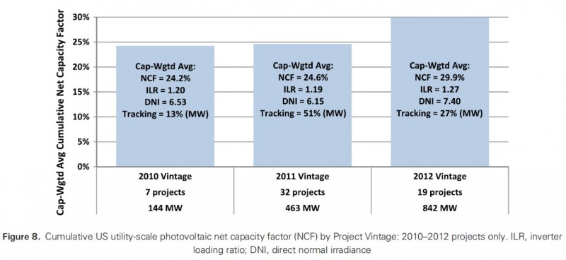 The EIA shows similar numbers, showing that the capacity factor of the entire solar PV fleet in the US in 2014 (including projects deployed before 2012) was 27.8%.