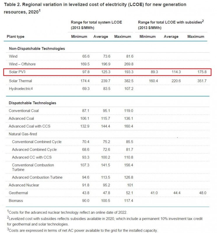 Exhibit A. In an update on June 2015, the EIA projected that the cheapest solar deployed in 2020 would cost $89 / mwh, after subsidies. That’s 8.9 cents / kwh to most of us. (This assumes that the solar Investment Tax Credit is not extended.)