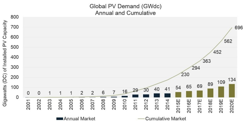GTM expects that by 2020, the world will be installing 135 GW of solar every year, and will have reached a cumulative total of nearly 700 GW of solar, roughly four times the 185 GW installed today.
