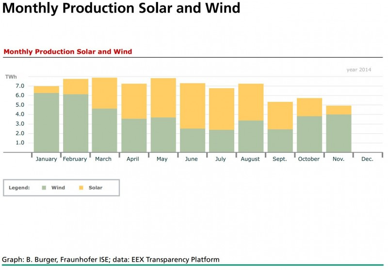 The same pattern is generally true across seasons. The sun is most available in summer months, wind most available in winter months. Here’s a view of 11 months in Germany: