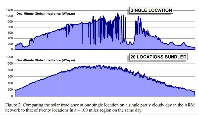 That also, by the way, makes the case for the grid. Renewables become far more reliable when integrated over a larger area. Integrating solar power over a wider area cuts the intermittency of clouds, for example:
