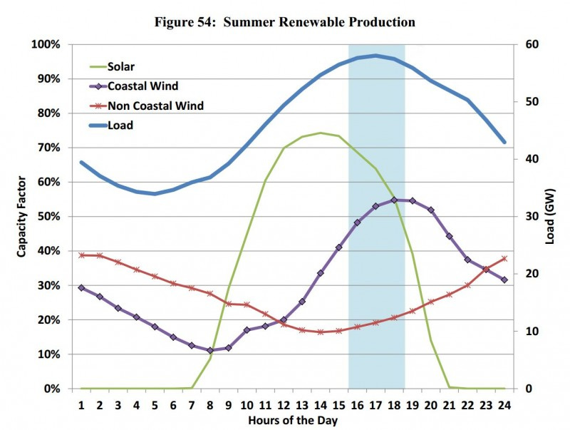 The top line is electricity load – demand being placed on the grid by people drawing electricity. Load peaks in daylight hours, but stays at that peak in the early evening. The sun sets before load drops, but the wind tends to kick in. And overnight, when no sun is shining, the wind blows, on average harder than it does during the day.