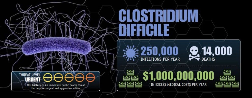 3) The antibiotic resistant bacteria c. difficile alone accounts for 14,000 deaths, or more than half the total. And deaths increased more than 400% between 2000 and 2007.
