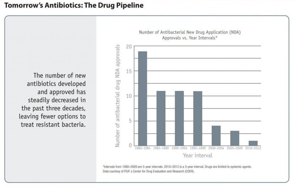 2) The pipeline for new antibiotic drugs is looking very very dry. The number of new antibiotics approved per 5-year period has been dropping over the long term. (The last data point is only a 3 year period, but even adjusting for that, it’s a new low.)