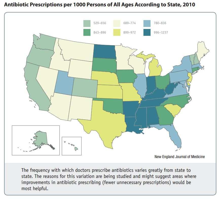 1) The rate of antibiotic prescription per person varies widely by state, with states like Mississipi prescribing antibiotics at twice the rate per person as states like California.
