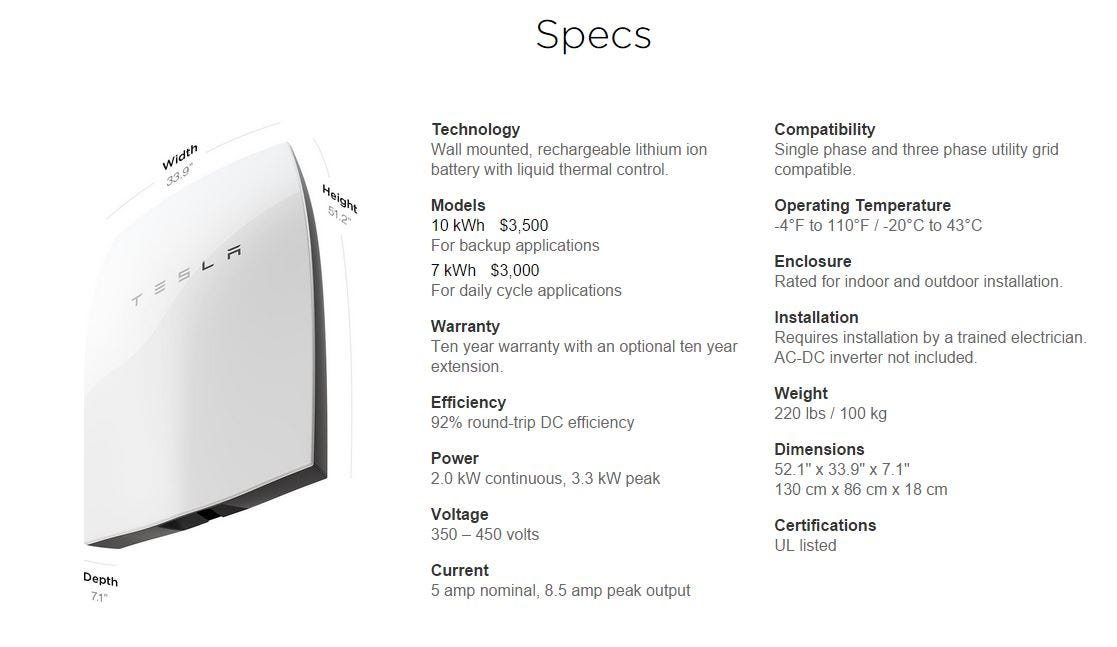 Here are the specs, from Tesla’s Powerwall site.