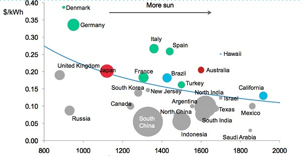 In some of the sunniest places in the world, though, retail electricity prices from the grid are substantially higher than the US, plenty of sunlight is available, and Net Metering either doesn’t exist or is being severely curtailed.