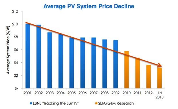 Wind, more established than solar, has seen it’s price decline by a factor of more than 20 over the last 30 years. The average wind power purchase agreement signed in 2013 was priced at 2.5 cents per kwh.