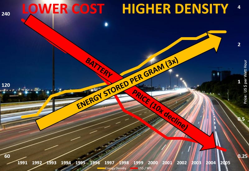 Between 1990 and 2005, the price per unit of energy stored in lithium-ion batteries dropped by a factor of 10, and the amount of energy that could be stored per unit weight nearly tripled.