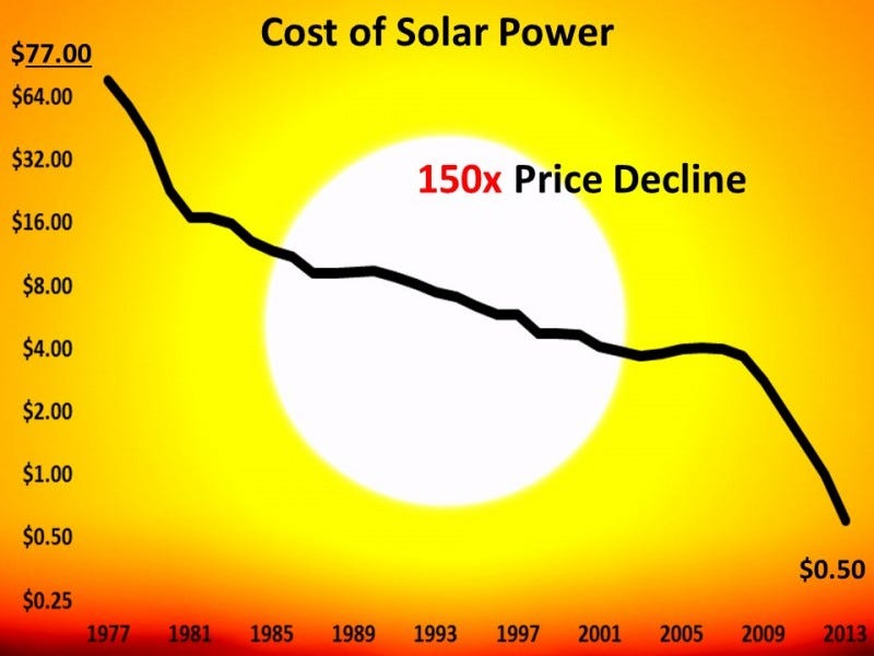 Solar makes wind look slow and sedate. Solar PV module prices have dropped an astounding 150x since 1977.