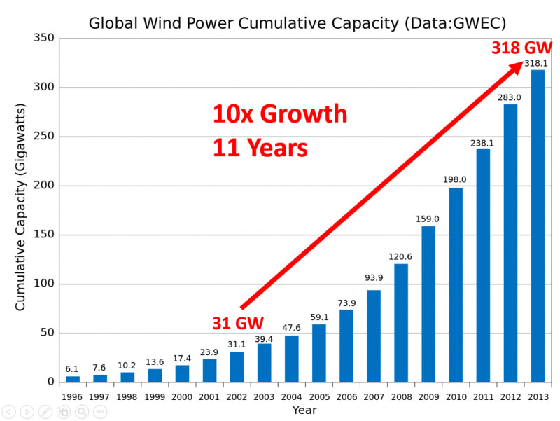 In scale, the amount of wind power around the world has grown by an astounding 10x (1000%) over the last 11 years. Incredible.