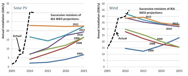 And in fact, the IEA predicts that new installations of solar and wind will stay flat or decline over time, despite all evidence to the contrary.